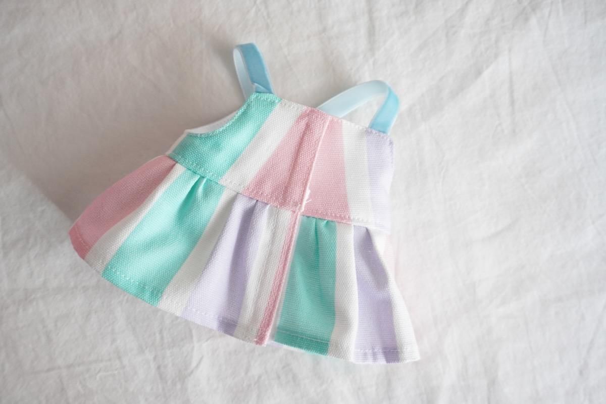 Sophieオリジナルファブリックで製作したぬいぐるみサイズのワンピースが入荷しました。SingちゃんやチムたんSサイズのぬいぐるみが着れるサイズ感のワンピースです。マジックテープなので着せやすいですよ。
