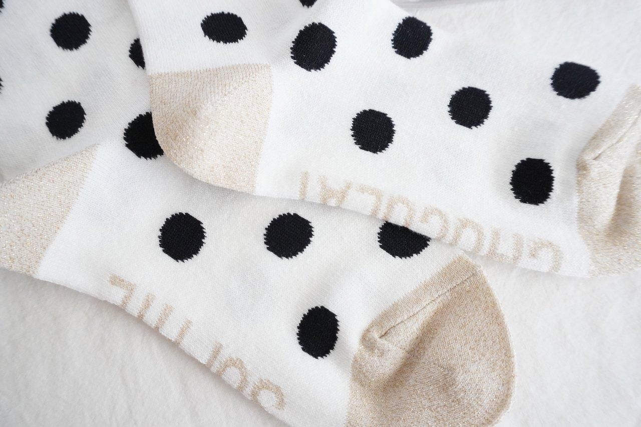 こちらは、オフホワイトベースにブラックDots、つま先&かかと部分のゴールドラメ色が足元にさりげないアクセントを効かせてくれます。
