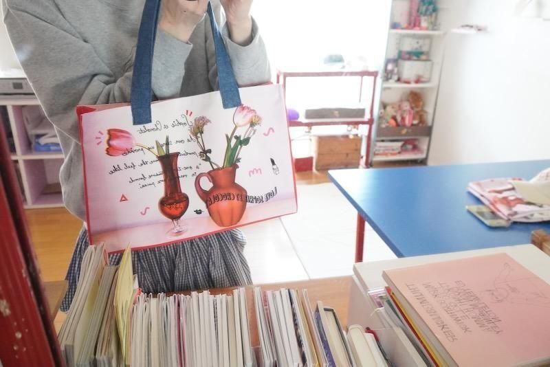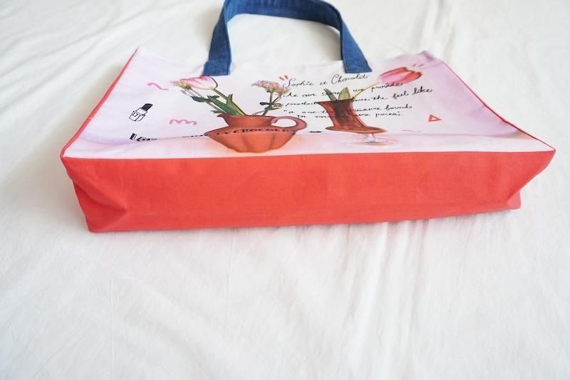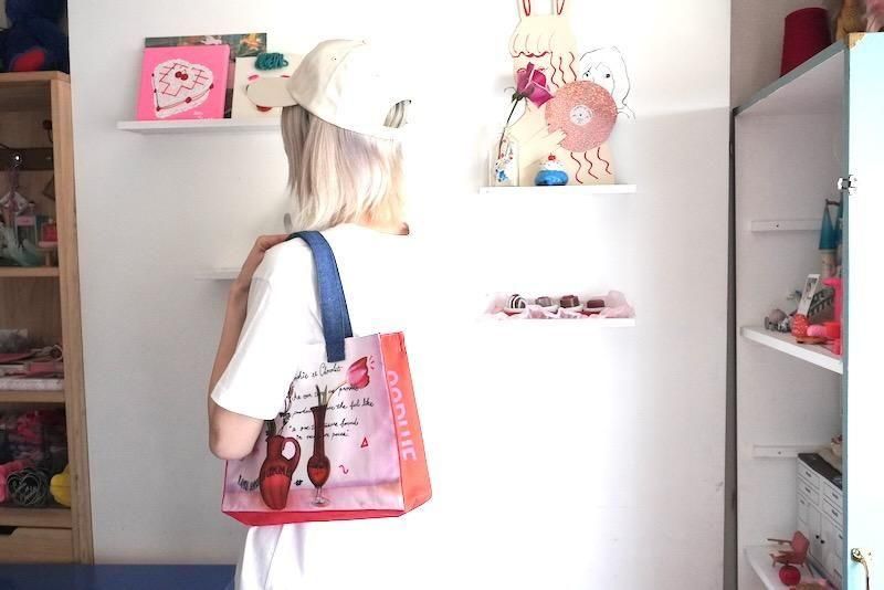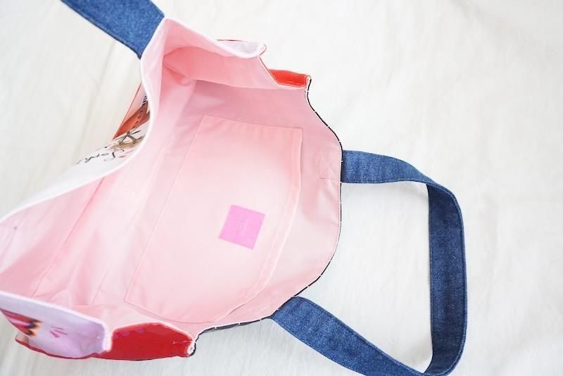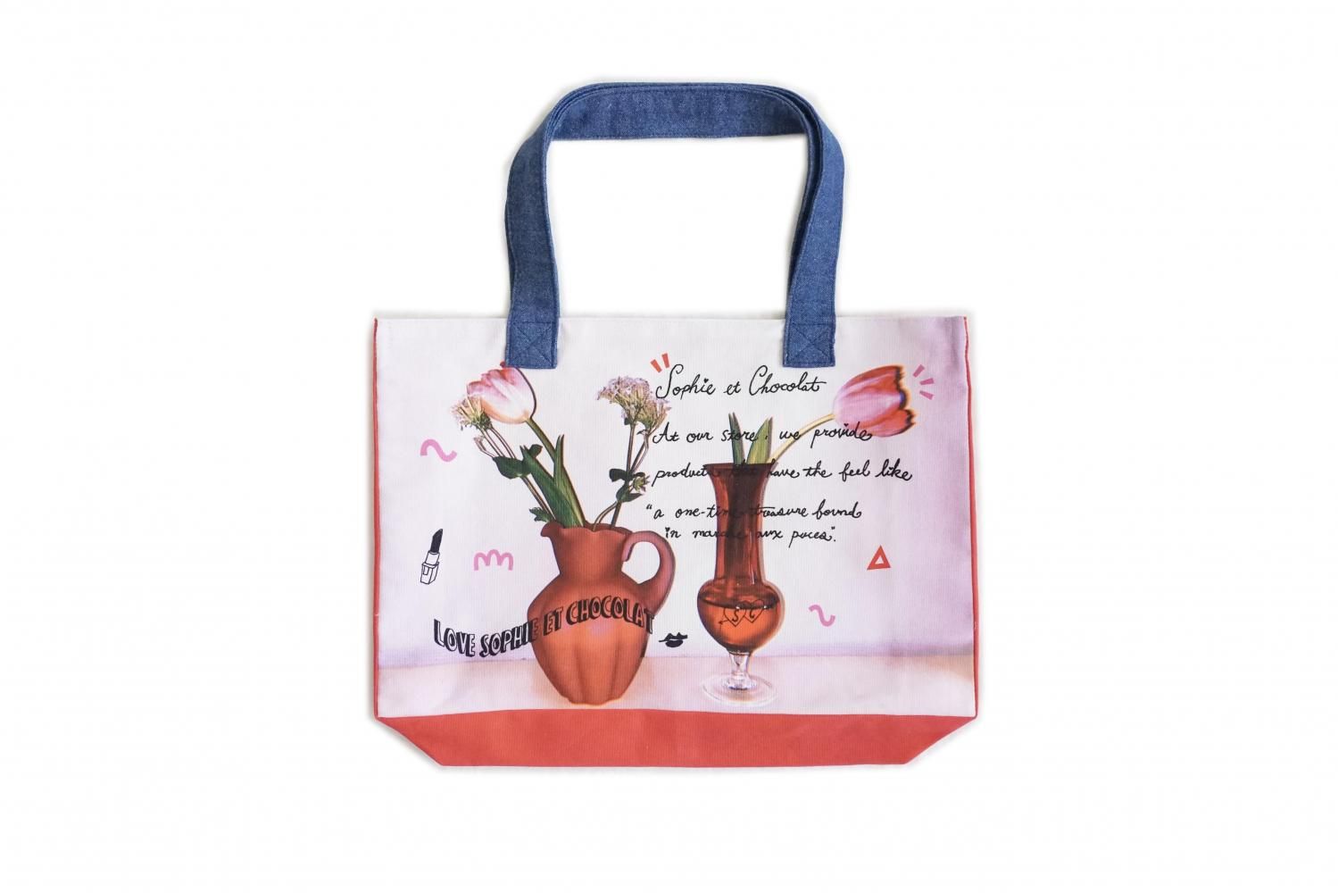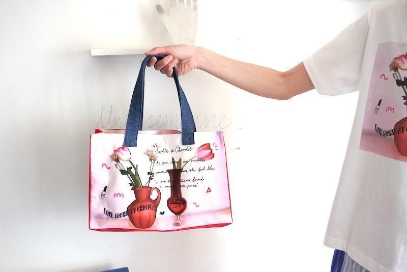 ヴィンテージの花瓶に生けられたチューリップにLOGOがミックスされたGirly x ARTな写真にオリジナルファブリックを組み合わせたトートバッグ。