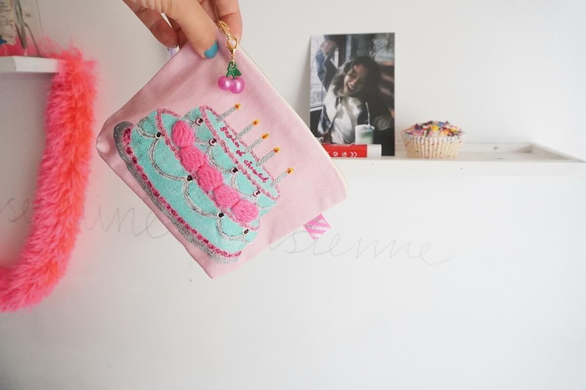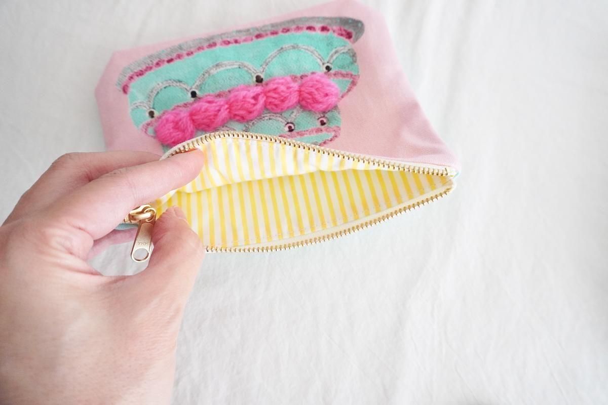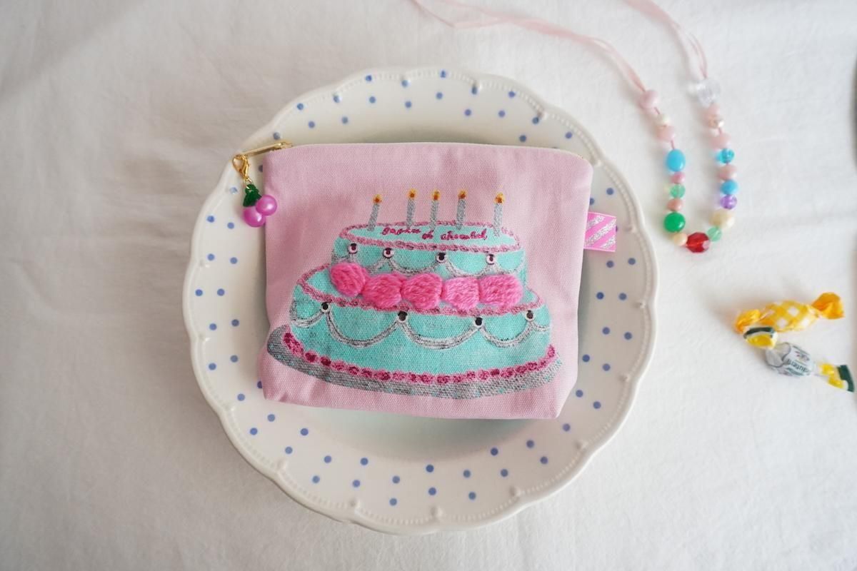 ピンクのホイップクリームがトッピングされた立体も楽しめるファスナーポーチです。