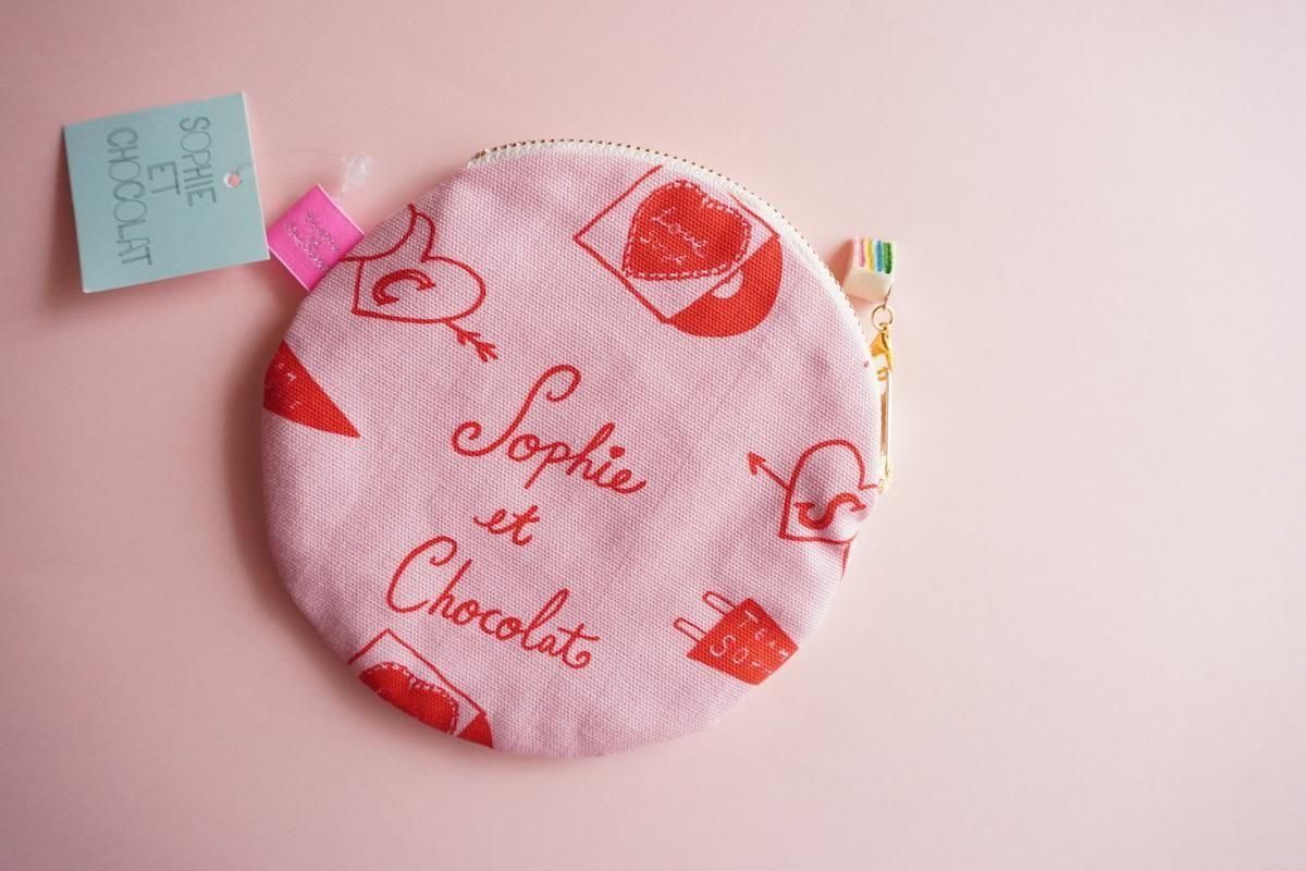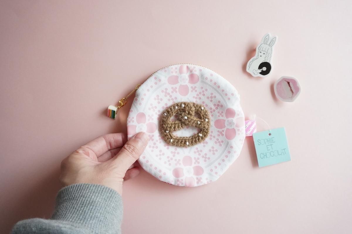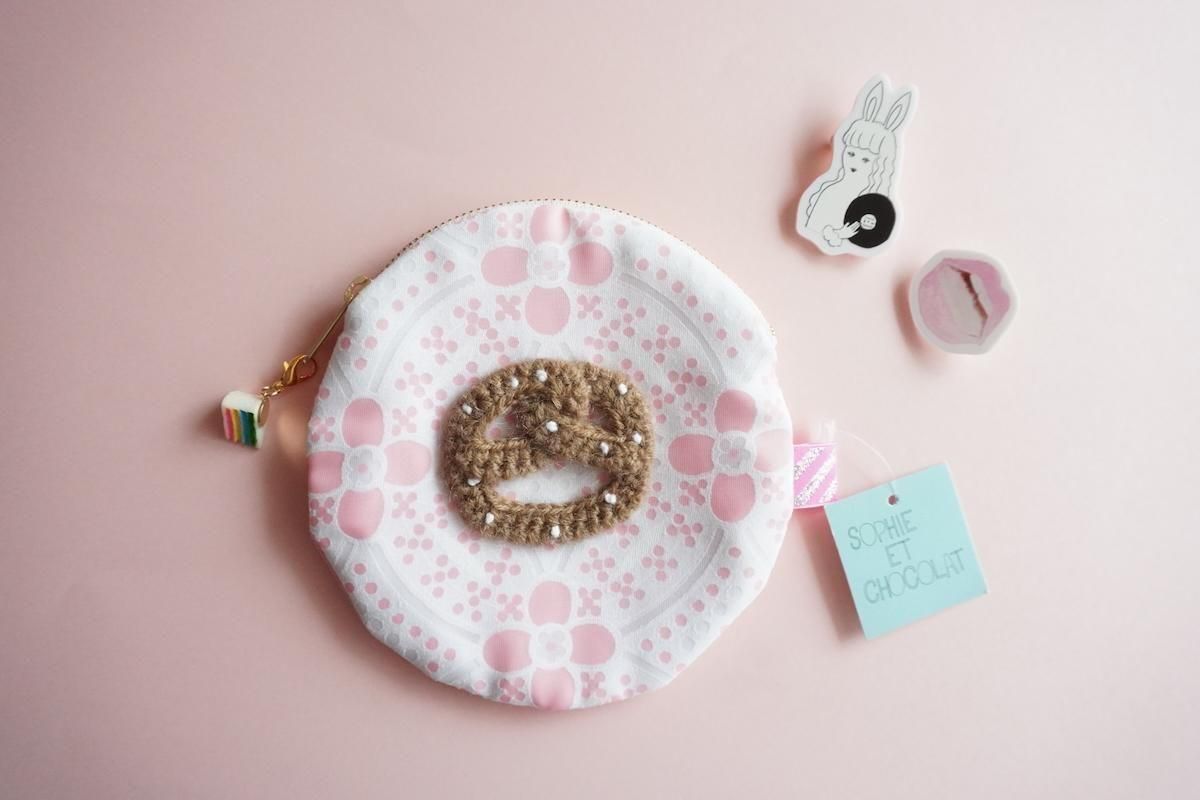 ヨーロッパのマーケットで見つけたヴィンテージのドレスファブリックに手編みのPretzelをトッピングしたシンプルなサークルポーチ。