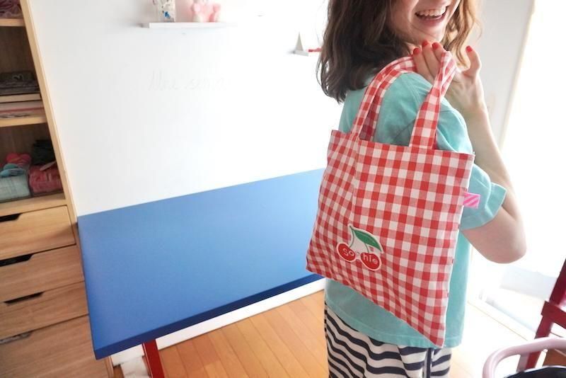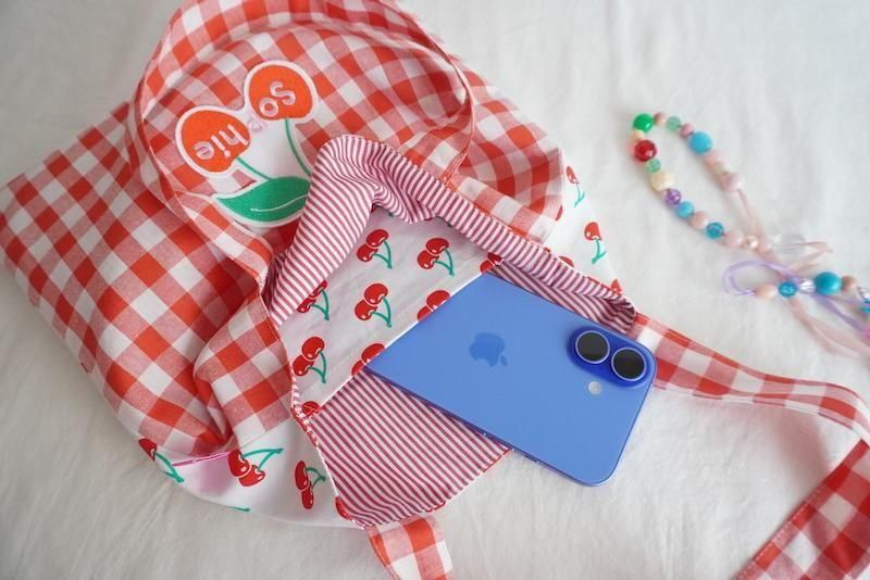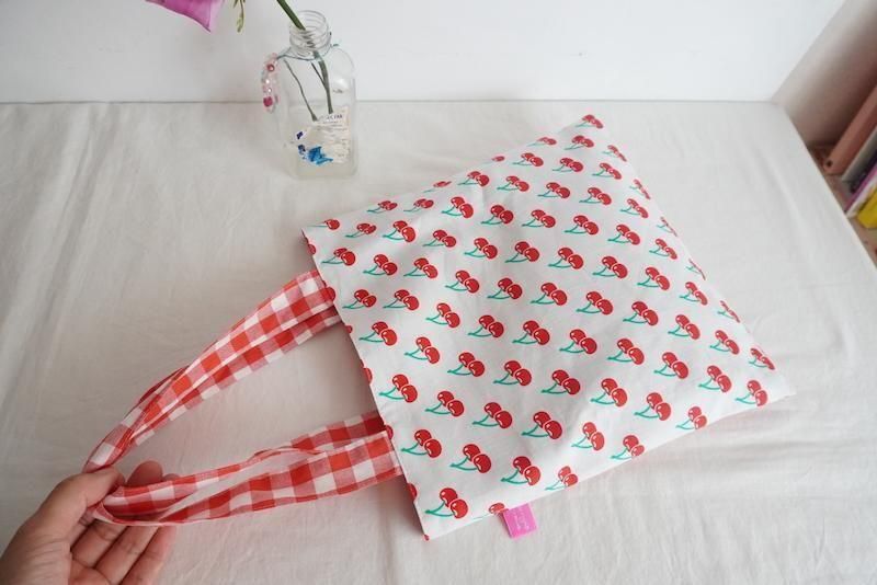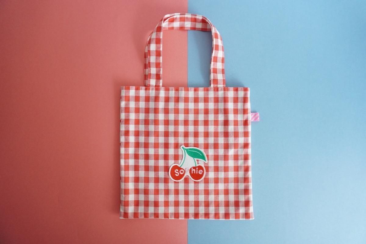 オリジナルのチェリーワッペンをトッピングしたギンガムチェックのトートバッグ。