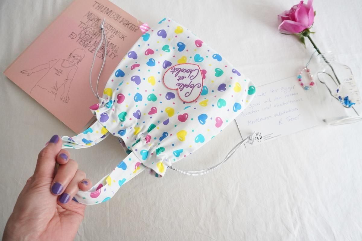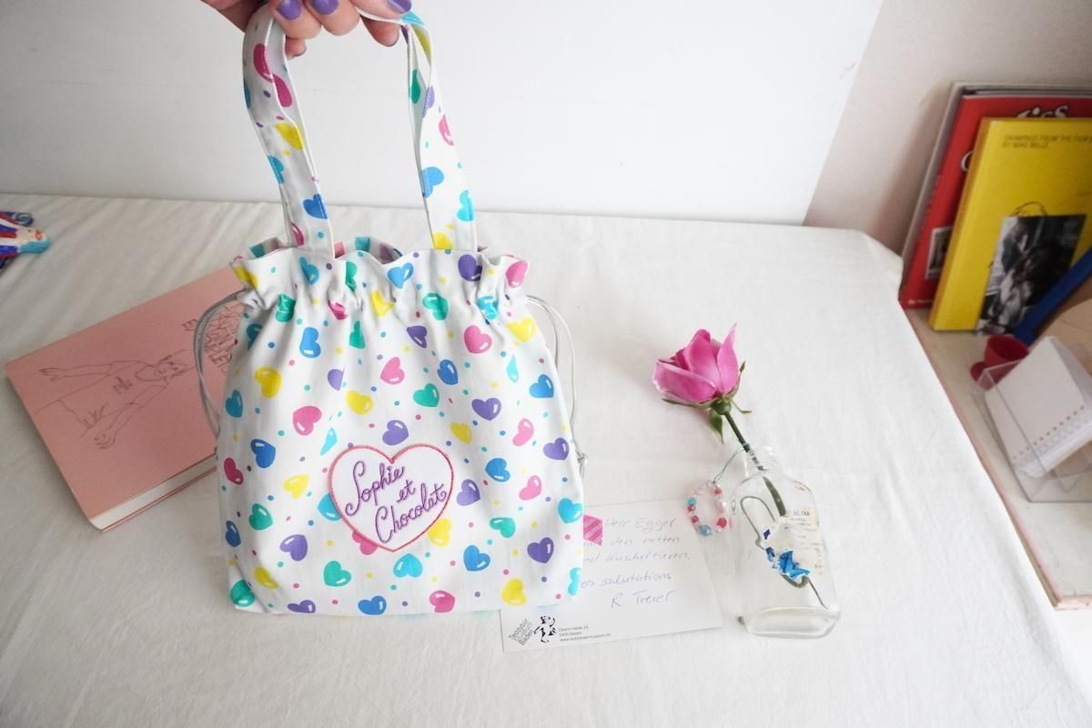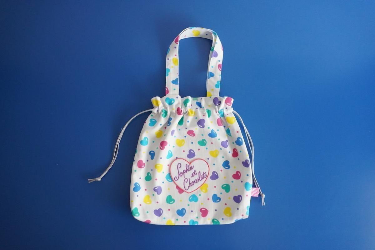 ハートワッペンがポイントのオリジナル生地で製作したミニ巾着バッグ。