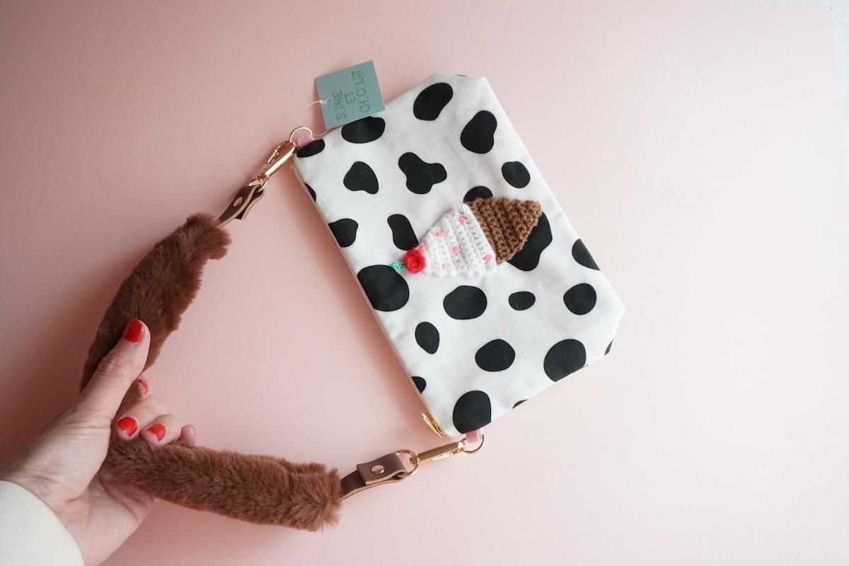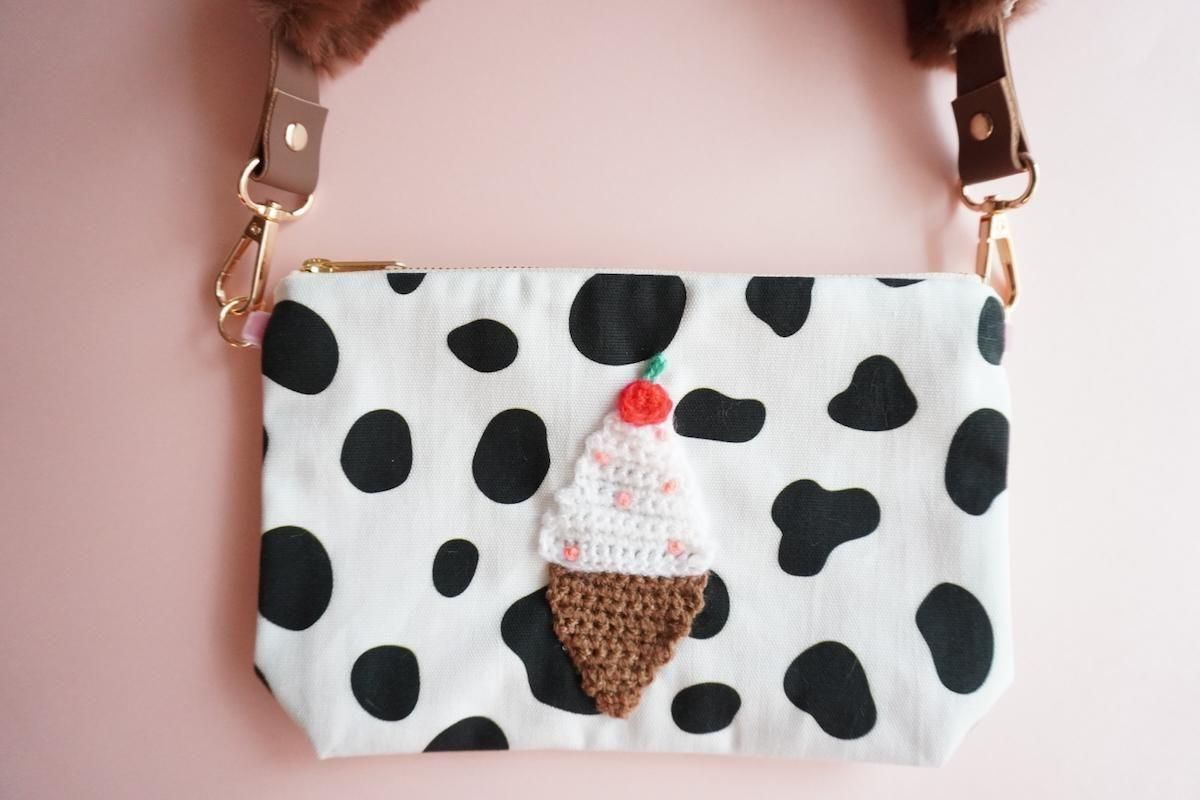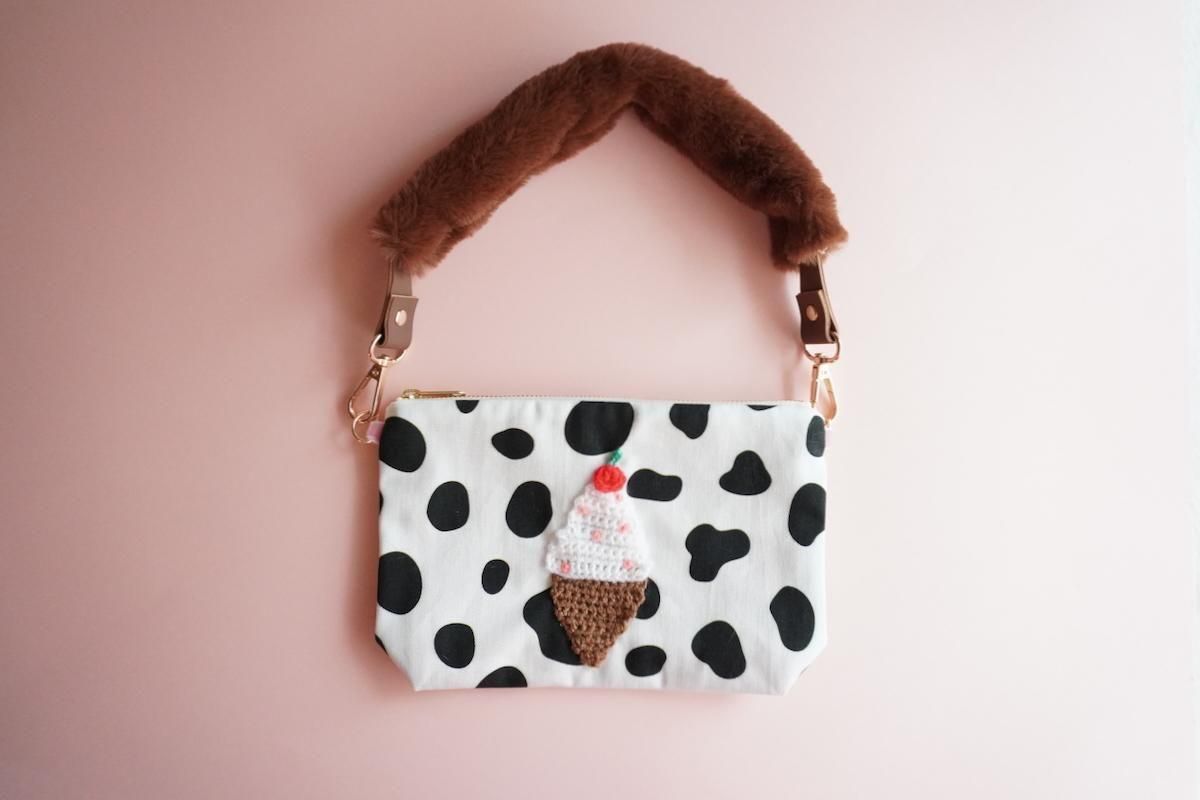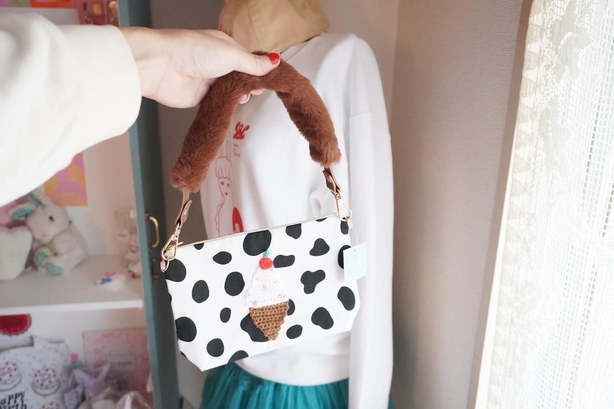 オリジナルファブリックで製作したポシェットに手編みのニットワッペンをプラス。