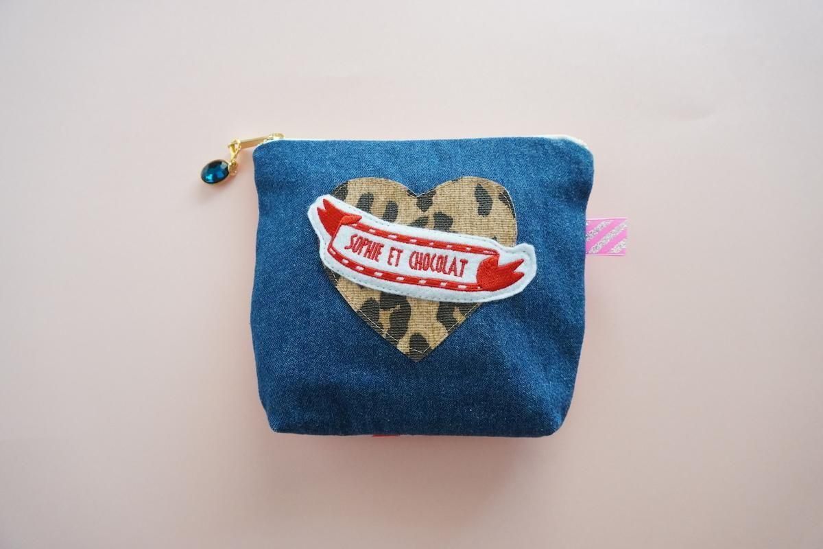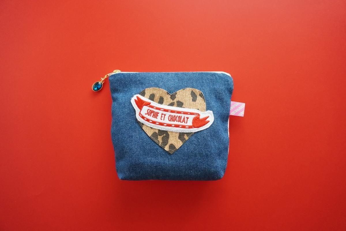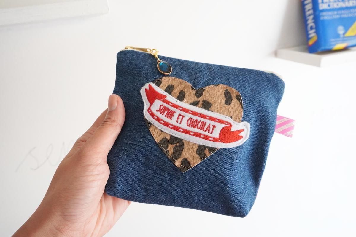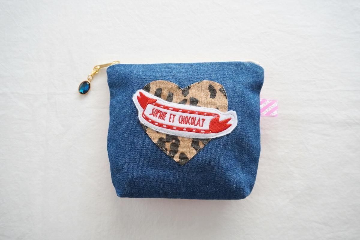 レオパードのハートにSophie et Chocolatの刺繍が重なったMサイズのポーチ。