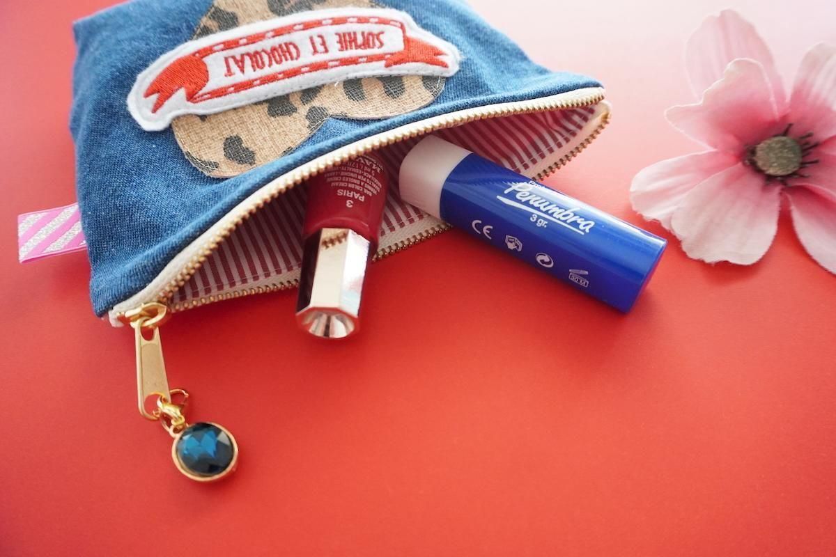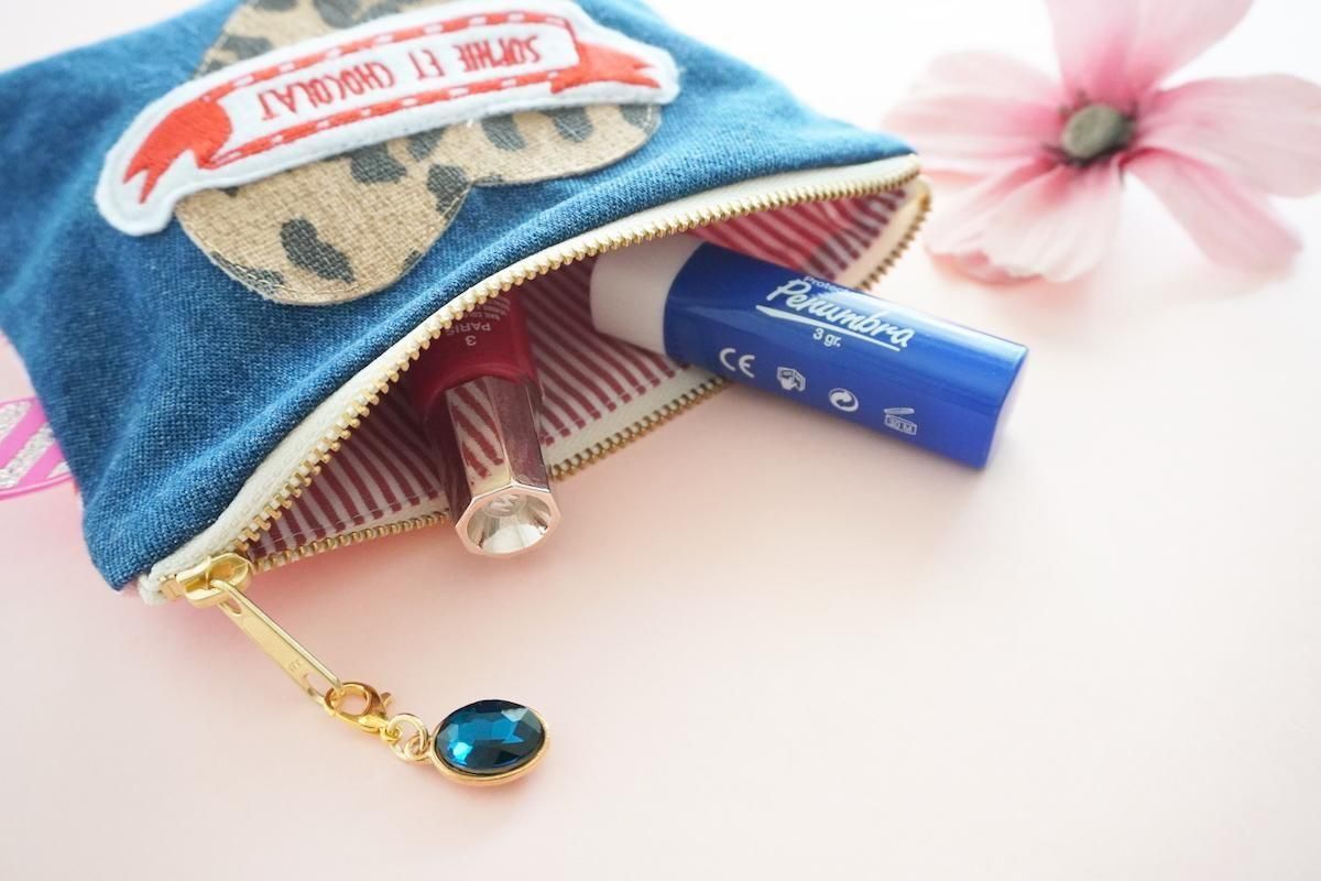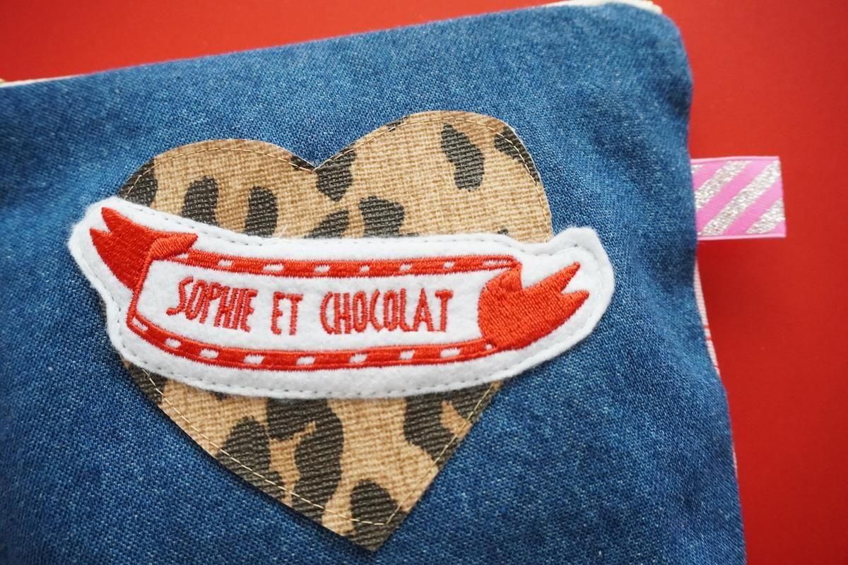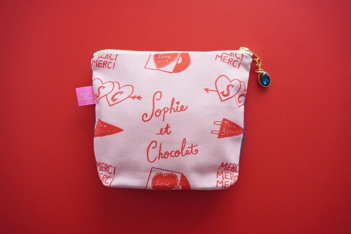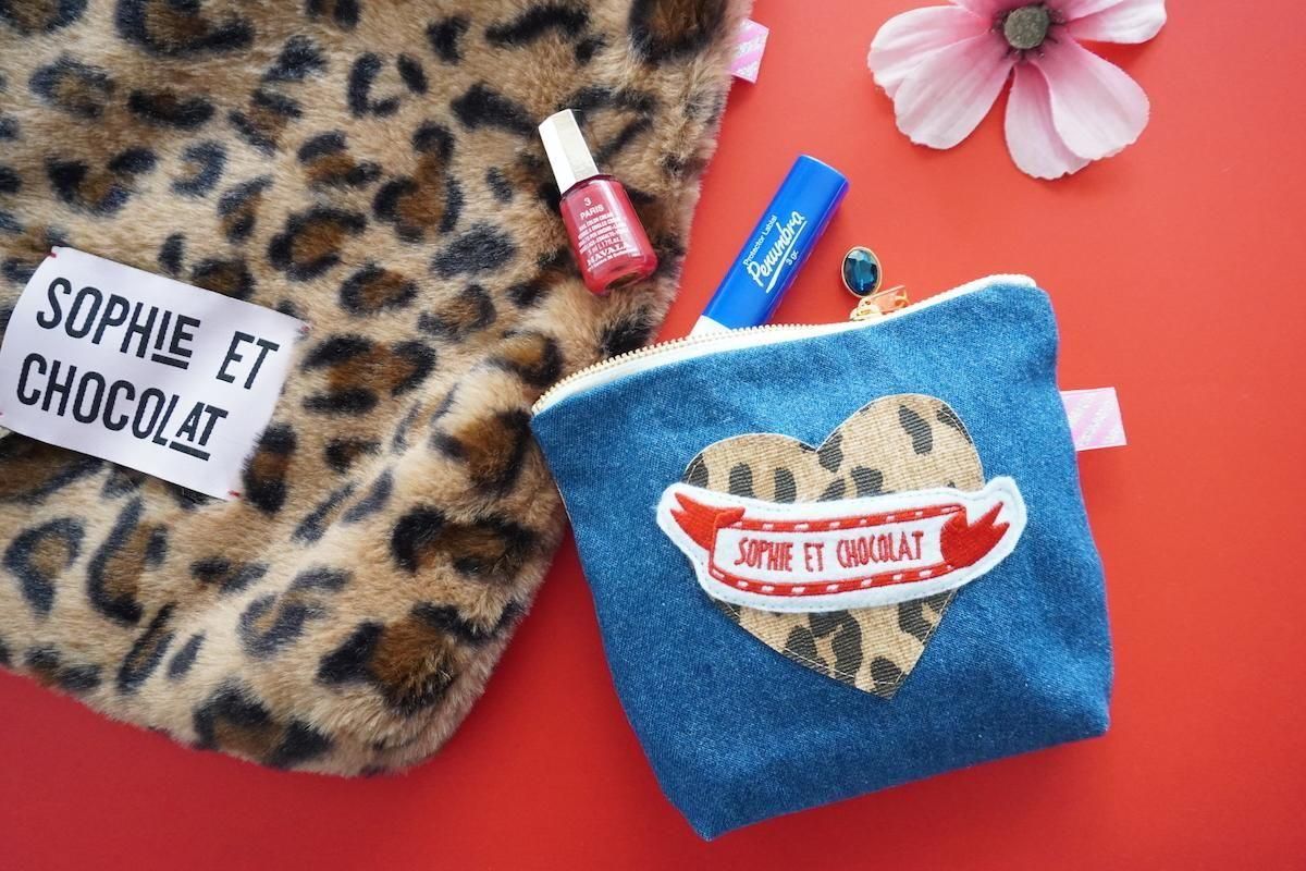 レオパードのハートにSophie et Chocolatの刺繍が重なったMサイズのポーチ。