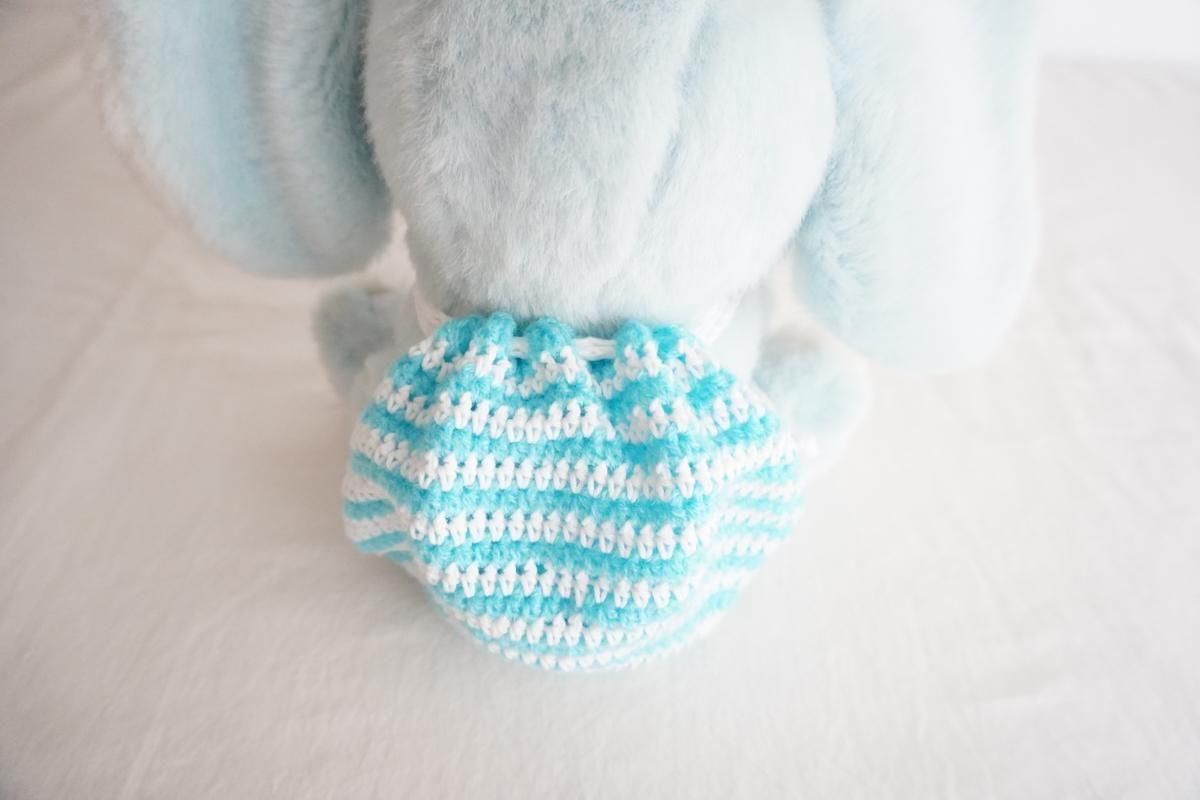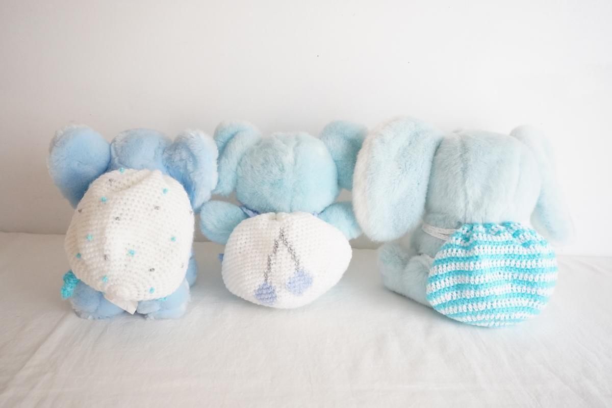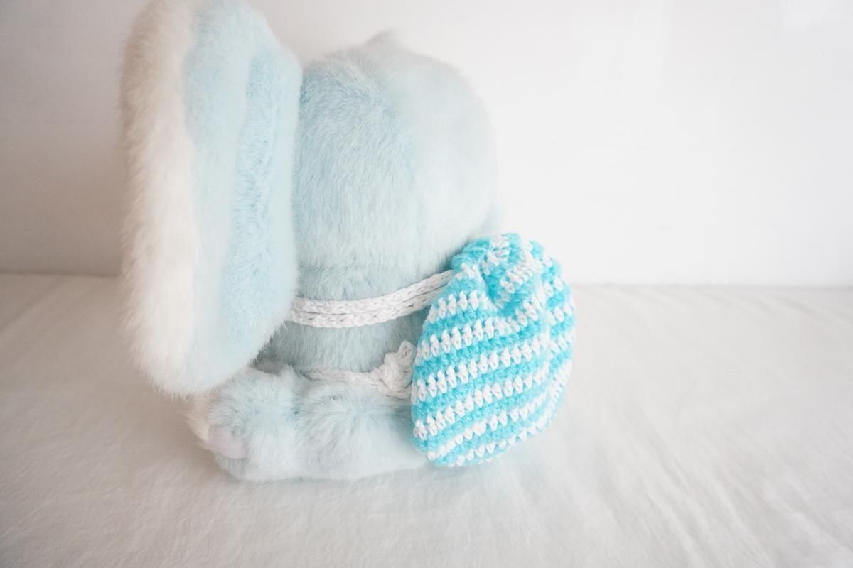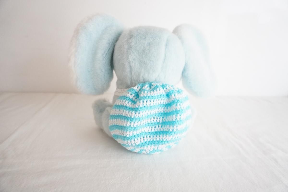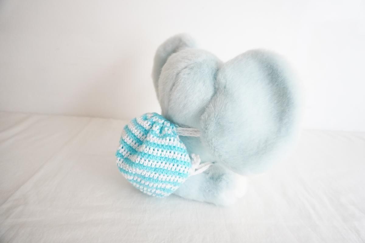 ソフィーニット部がこのゾウさんの為に似合いそうなボーダーのバックパックを編みました。取り外して中に物を入れられますよ。