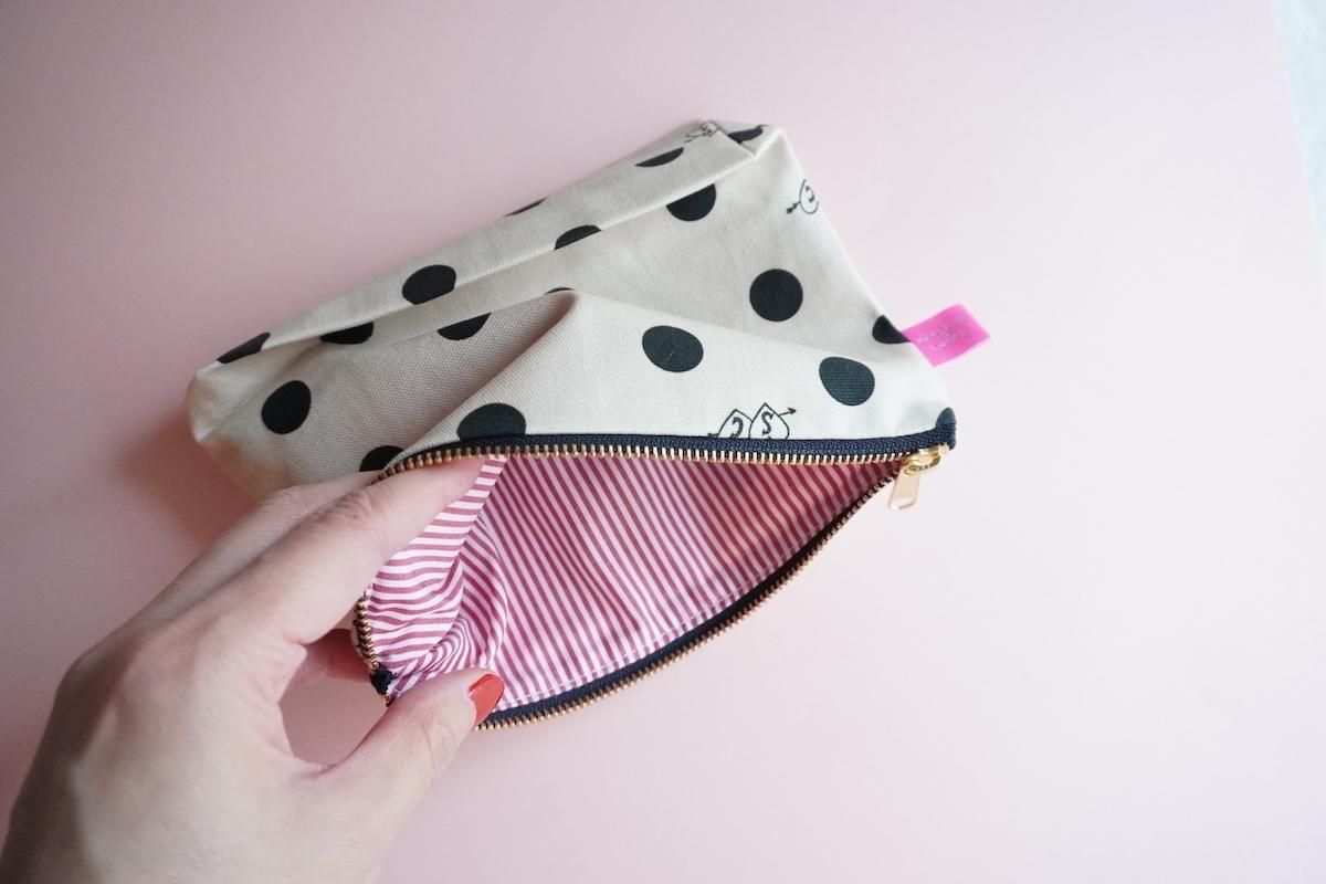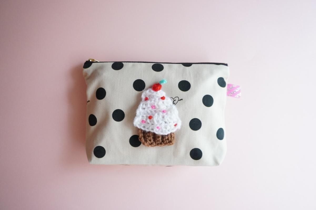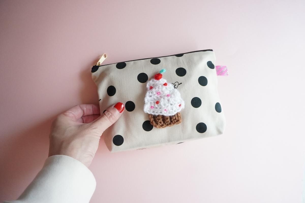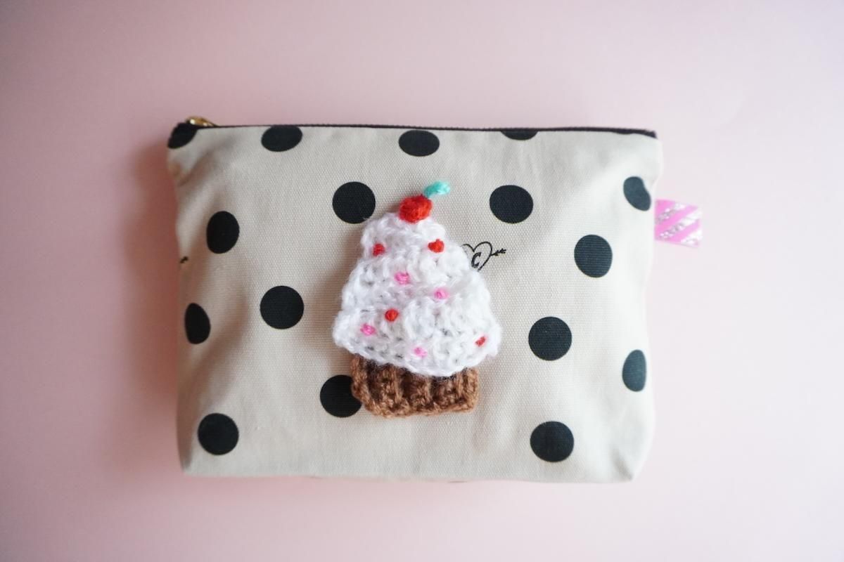 オリジナルファブリックに手編みのカップケーキワッペンを組み合わせたファスナーポーチ。