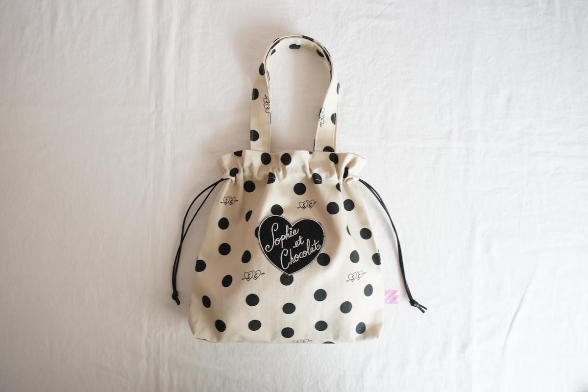 ハートワッペンがポイントのオリジナル生地で製作したミニ巾着バッグ。