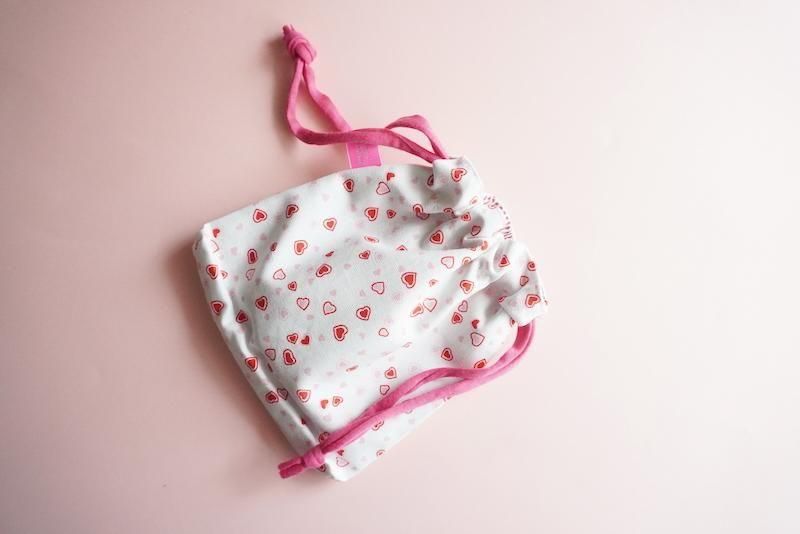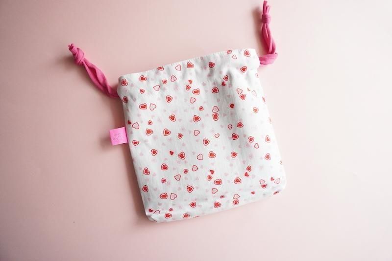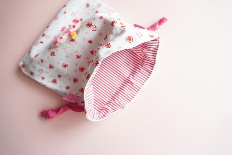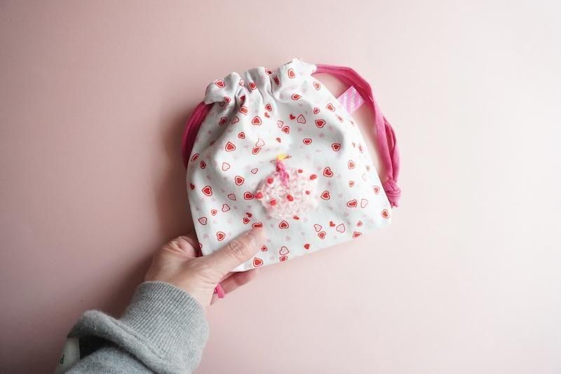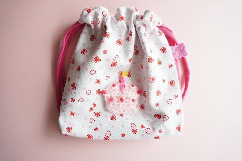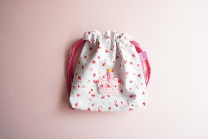 オリジナル生地に手編みのケーキワッペンがトッピングされた定番の巾着ポーチ。