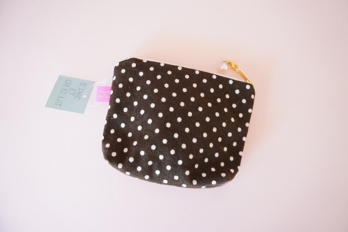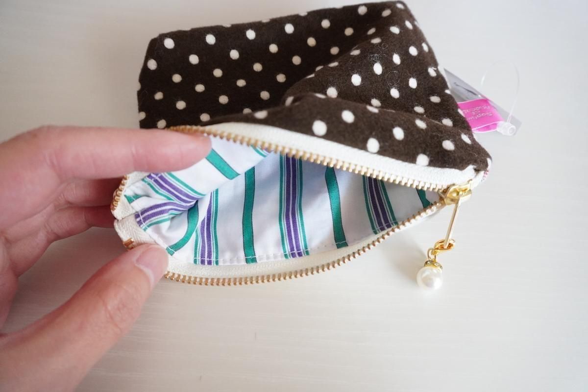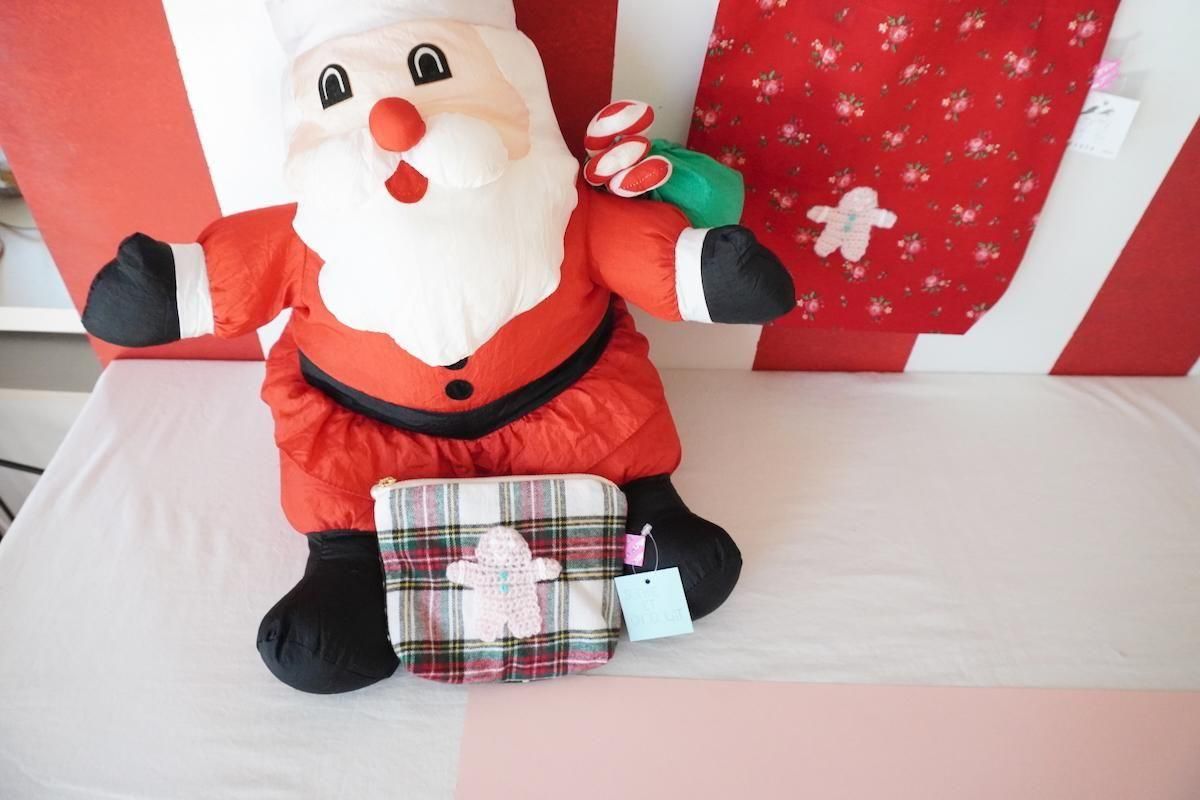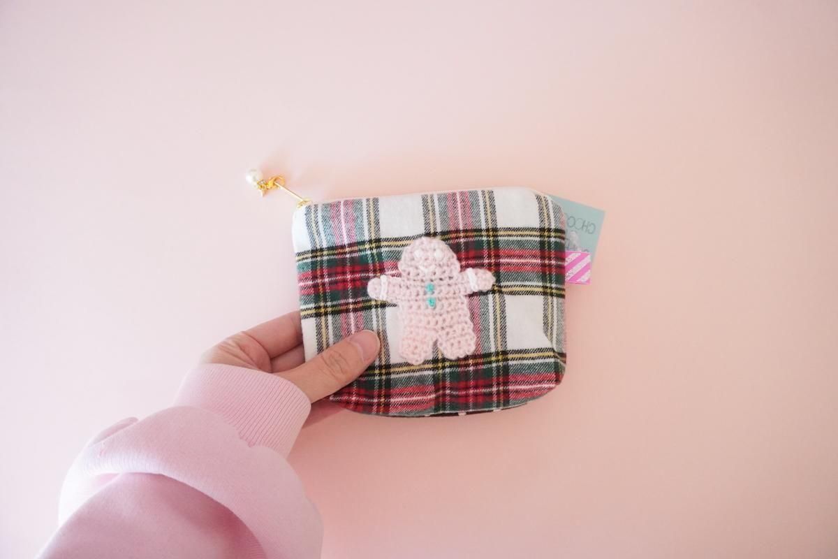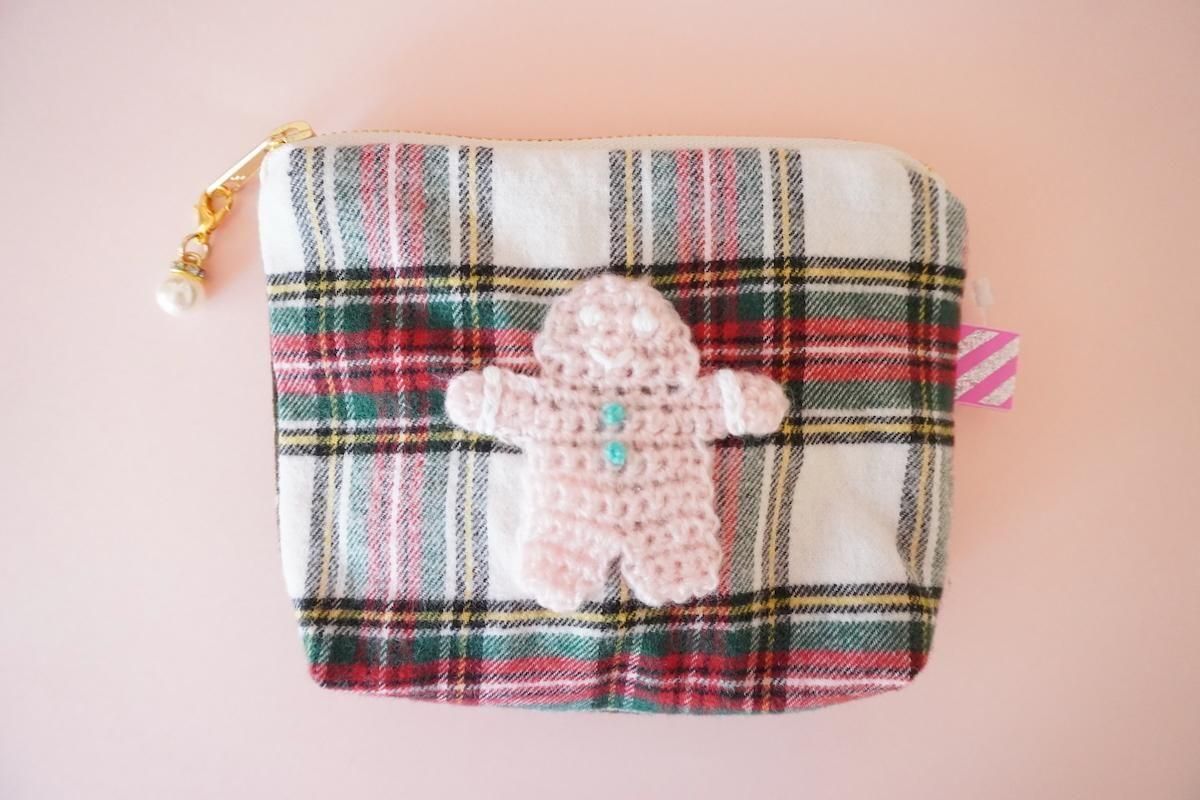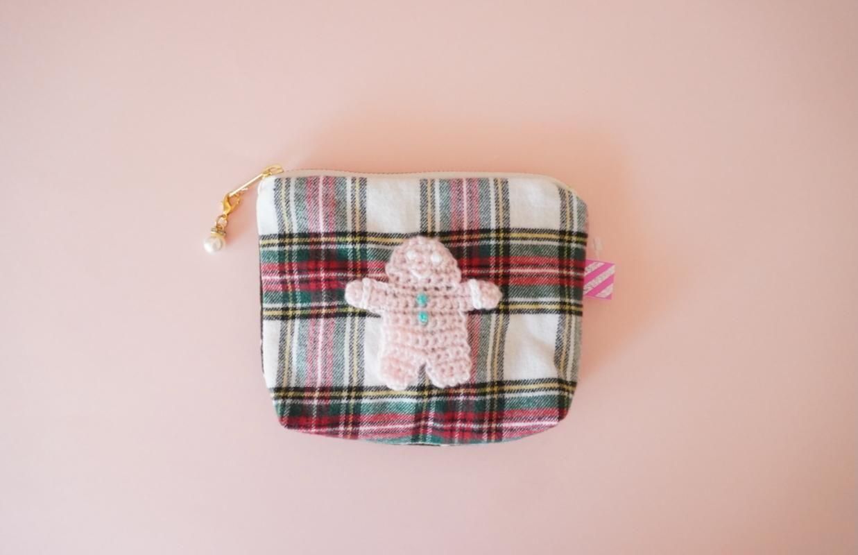 ソフィーオリジナルのクリスマスファブリックに手編みのジンジャーマンワッペンをトッピングしたファスナーポーチ。チャーム付きでお届けします。