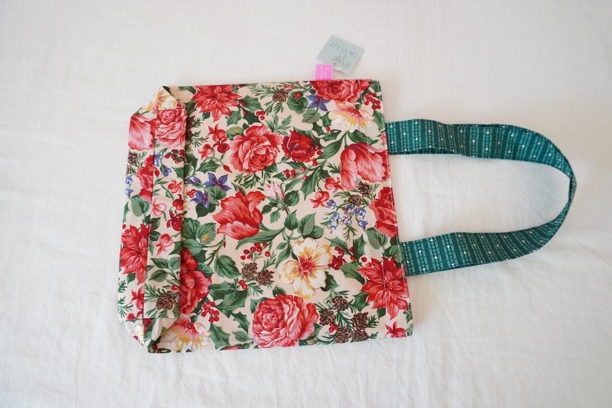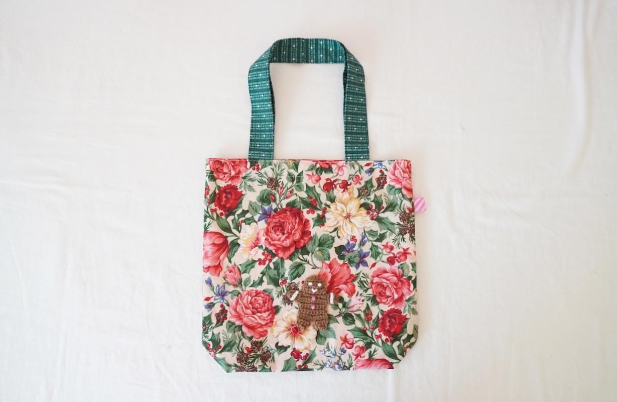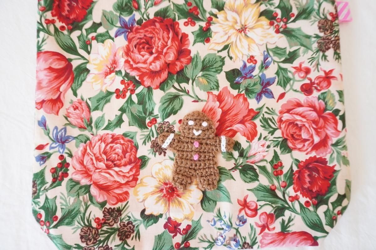 海外で見つけたヴィンテージのクリスマスファブリックに手編みのジンジャーマンワッペンをトッピングしたトートバッグ。内ポケット付き!