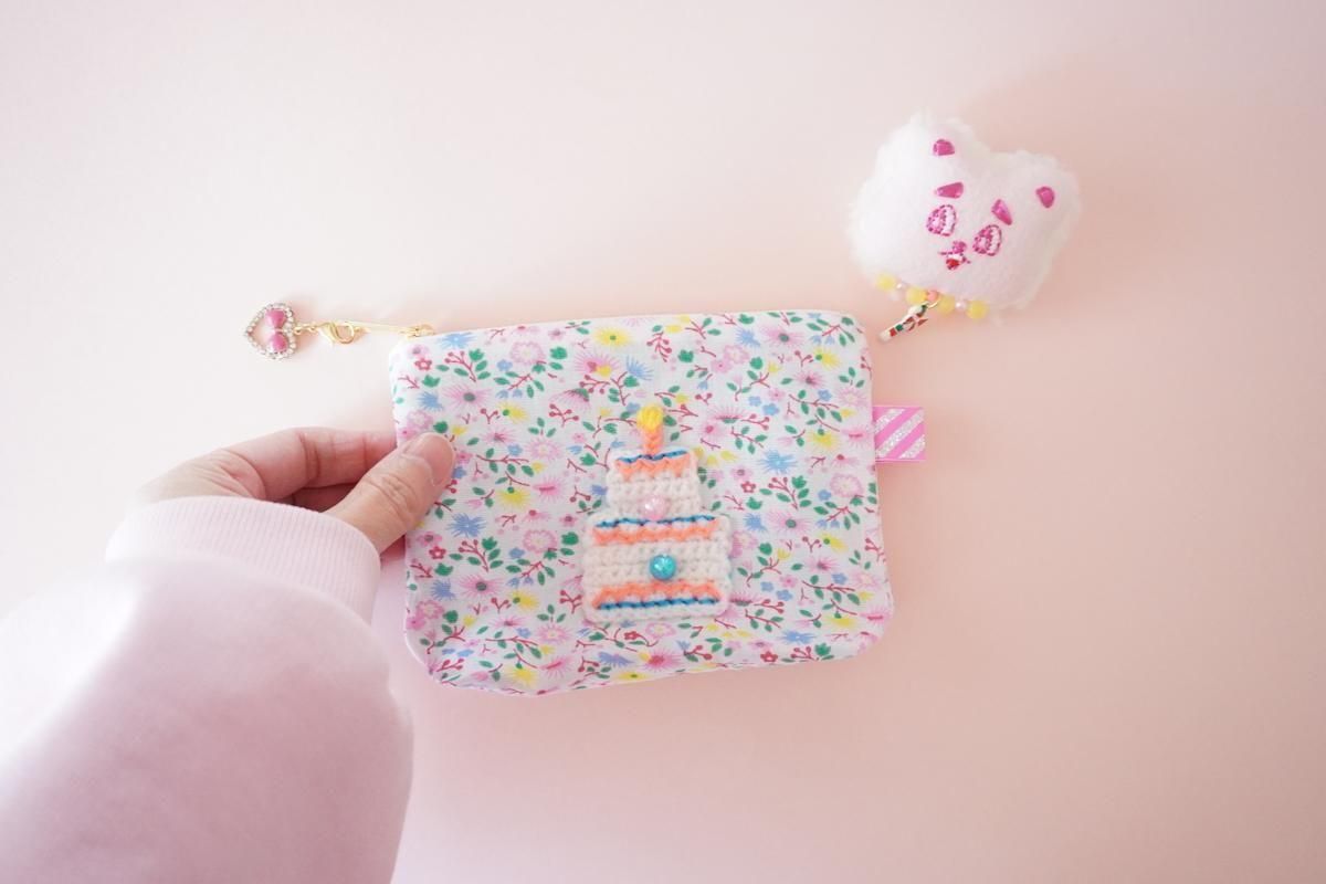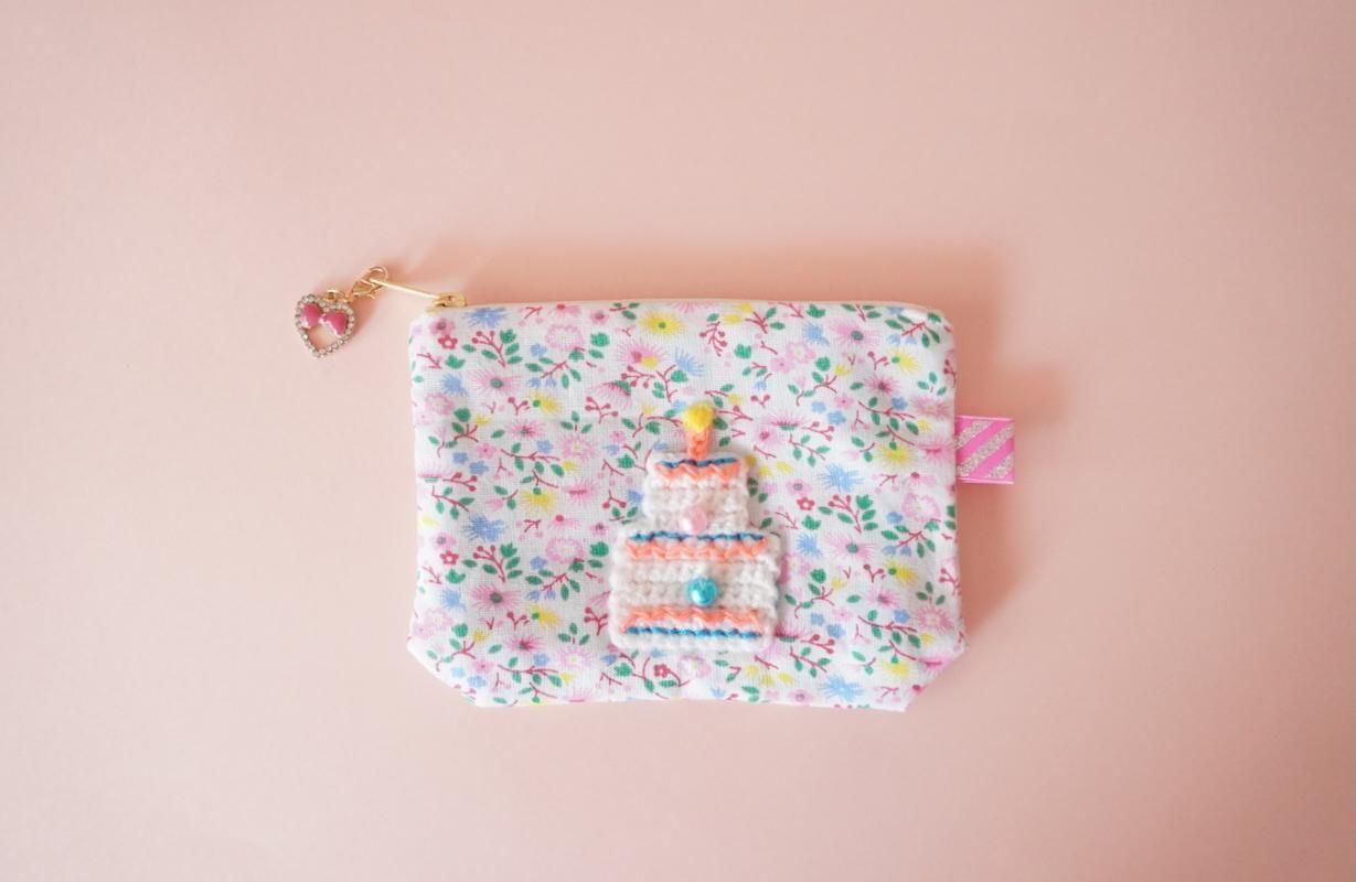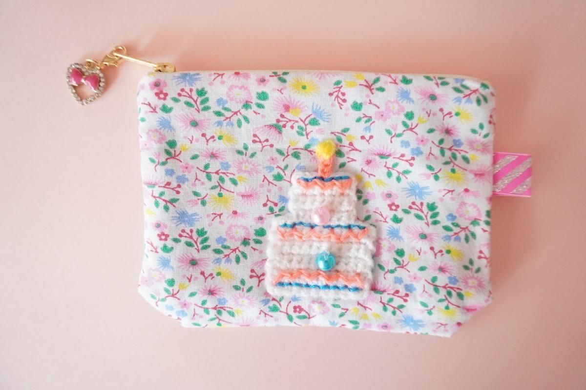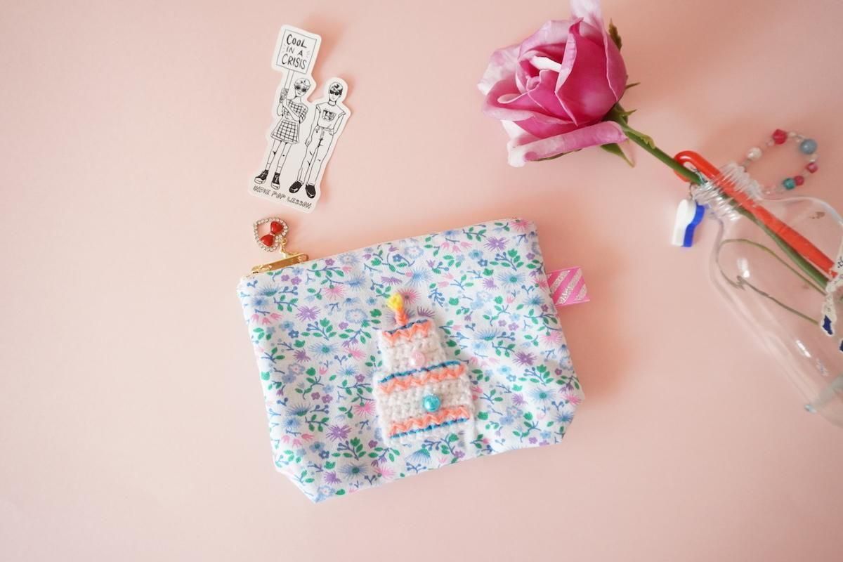 ヴィンテージの小花柄ファブリックに手編みのケーキワッペンが付いたミニポーチが仕上がりました。