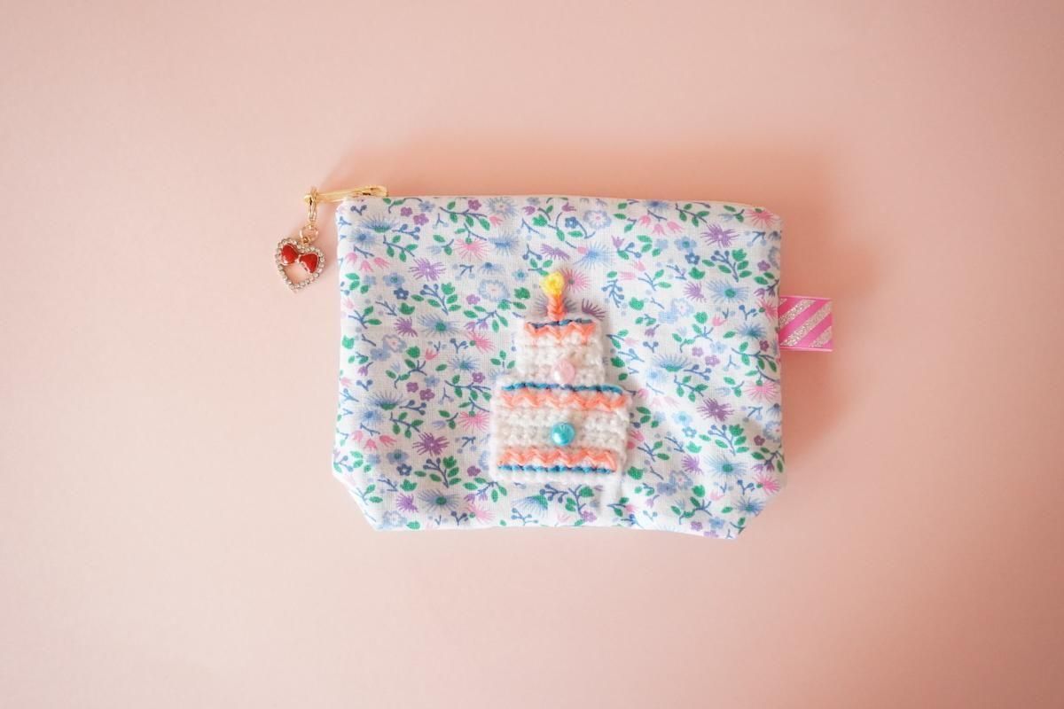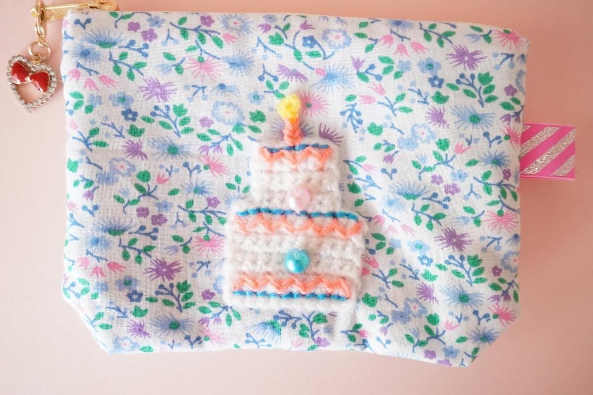 ヴィンテージの小花柄ファブリックに手編みのケーキワッペンが付いたミニポーチが仕上がりました。