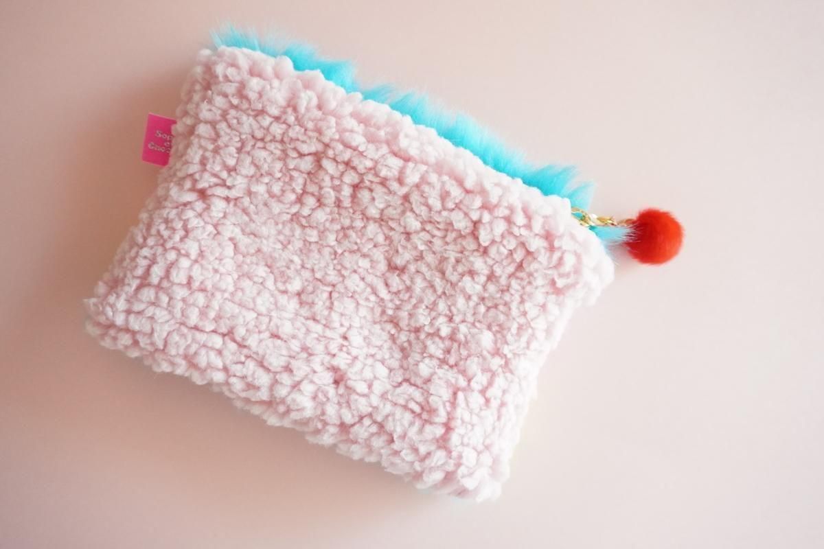 レインボーのファーにワッペンがトッピングされたミニポーチ。